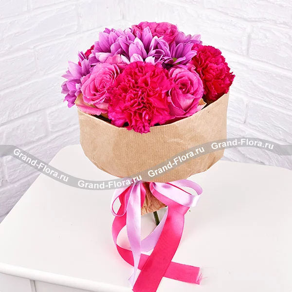 Букет составлен из роз сорта Аква, хризантемы кустовой созвучного оттенка и малиновой гвоздики, придающей букету шарм и очарование. Стильная крафтовая упаковка и лента в тон букету завершают композицию букета. Высота букета от 35 см, а диаметр от 25 см до 40 см в зависимости от выбранного Вами варианта букета.